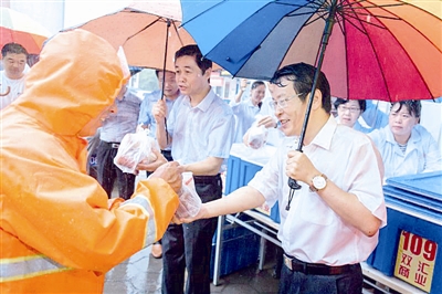 (記者 劉 丹 版式 付廣亞)市委書記蒿慧杰冒雨看望堅(jiān)守一線的環(huán)衛(wèi)工人,并送上免費(fèi)愛(ài)心早餐。
