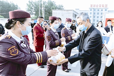 “情系公交司機(jī)”愛(ài)心早餐工程啟動(dòng)儀式上,市人大常委會(huì)副主任、市總工會(huì)主席陳平為公交司機(jī)發(fā)早餐。