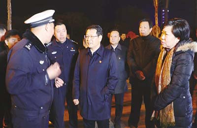12月24日晚,市委書(shū)記蒿慧杰在金山路與龍江路交叉口交通管控卡點(diǎn),察看環(huán)保管控措施落實(shí)情況并實(shí)地督導(dǎo)檢查。記者 王慶建 攝