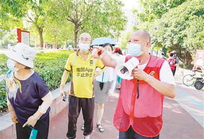 “大家排好隊,十人一組,不要著急。”8月7日,在開來怡景小區(qū)旁的核酸檢測采樣點,開來怡景小區(qū)業(yè)委會主任張曉伍幫忙維持現(xiàn)場秩序。從早上9點忙到晚上10點,他的嗓子啞得說不出來話。