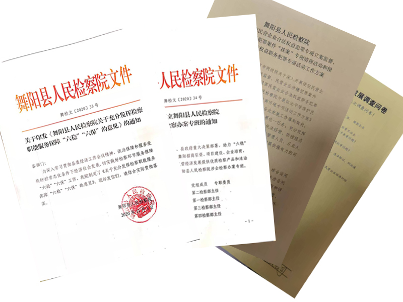 “六穩(wěn)”“六保”是當(dāng)前全黨全國的一項重要中心工作,也是檢察機關(guān)服務(wù)大局的重中之重。今年以來,舞陽縣檢察院認(rèn)真學(xué)習(xí)貫徹習(xí)近平總書記重要講話精神,按照市檢察院和縣委部署要求,立足職能、主動謀劃,以更優(yōu)的檢察履職、更高的檢察自覺,為地方民營企業(yè)發(fā)展注入檢察力量、打好檢察標(biāo)簽,把服務(wù)“六穩(wěn)”“六保”真正落實落細(xì)。