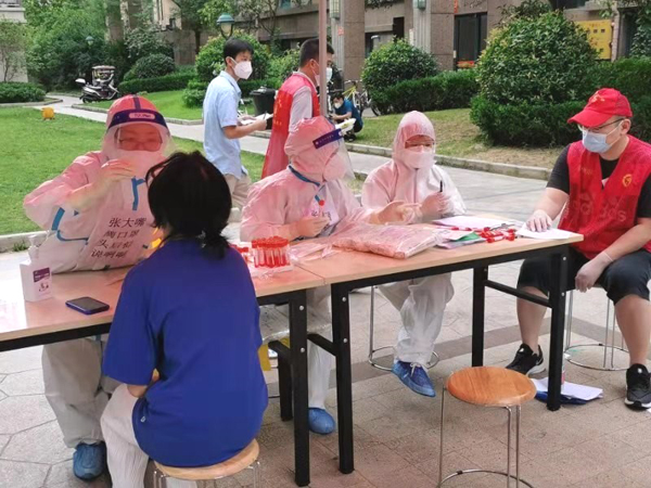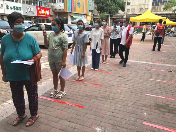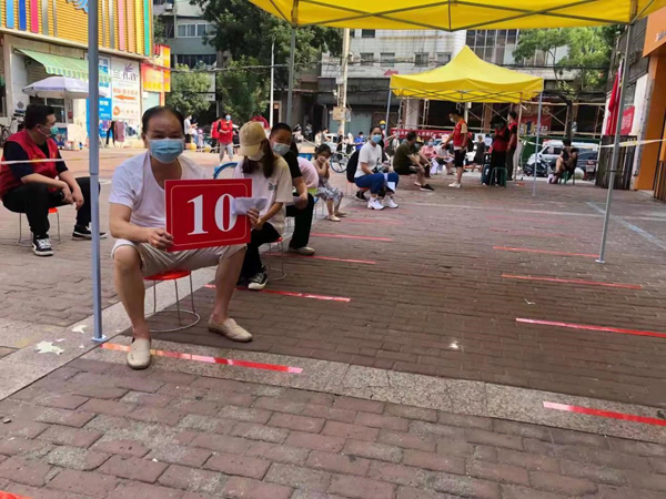 在各檢測(cè)點(diǎn)筆者看到,身穿紅馬甲的志愿者忙忙碌碌搞服務(wù),身穿防護(hù)服的醫(yī)護(hù)人員一絲不茍地在采集樣本,不時(shí)有各級(jí)領(lǐng)導(dǎo)、衛(wèi)健委的專家巡回開展工作指導(dǎo)。在長(zhǎng)申玉檢測(cè)點(diǎn),把居民分小區(qū)、按樓棟組織參加檢測(cè),嚴(yán)格做到間隔一米線,不扎堆,不聚集;馬路街辦事處14號(hào)檢測(cè)點(diǎn)在嚴(yán)格執(zhí)行一米線的同時(shí),還提前對(duì)居民按照10人一組分組排號(hào),有力提高了檢測(cè)效率,志愿者還幫助有困難的群眾看護(hù)孩子、開展信息登記等工作。