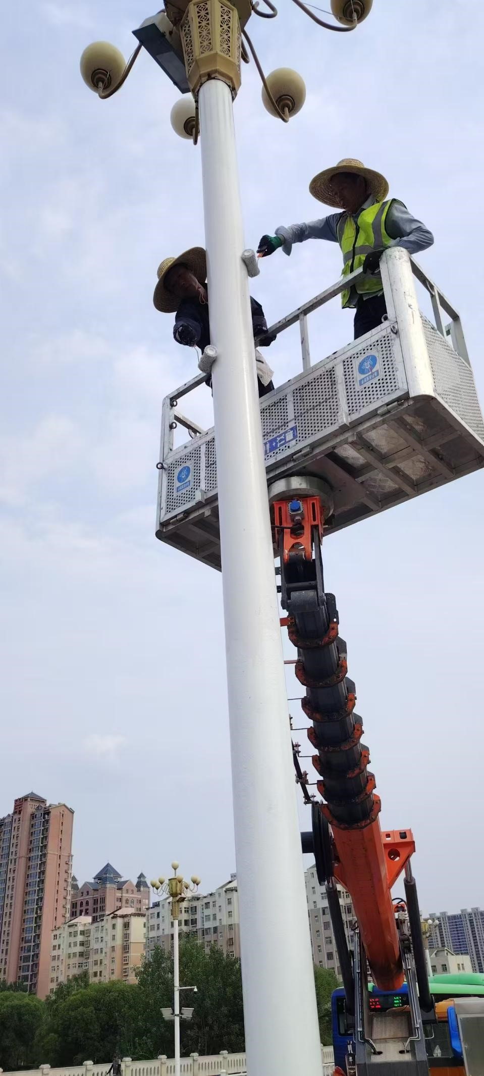 針對橋梁燈桿位于河道之上,和環(huán)境潮濕的特點,此次燈桿刷漆特別選用丙烯酸聚氨酯面漆,使其抗氧化耐腐蝕,耐候性更強。在施工中,工作人員使用高空作業(yè)車升空至10余米高度操作,在全面做好安全措施的基礎(chǔ)上,盡量減少對市民出行的影響,采取早上和傍晚作業(yè)的方式,在適宜油漆作業(yè)的溫度進行刷漆作業(yè),期間市政人員不畏高空、風大等因素,在盡量保護原鍍鋅膜的基礎(chǔ)上,先對脫漆銹蝕部位進行清理,再對燈桿進行打磨除塵,著重對銹點部位涂刷防銹漆后再對整桿燈桿進行刷漆。