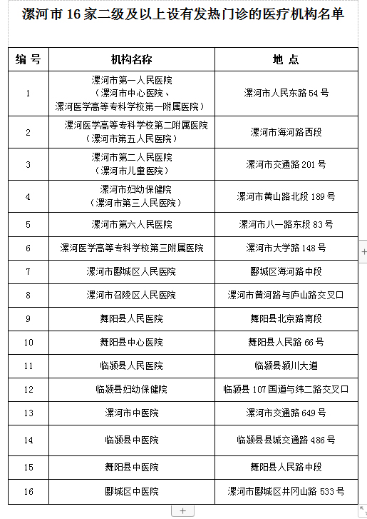根據(jù)河南省衛(wèi)生健康委發(fā)布《關(guān)于印發(fā)河南省新型冠狀病毒感染的肺炎醫(yī)療救治定點(diǎn)醫(yī)院名單的通知》豫衛(wèi)醫(yī)函〔2020〕2號(hào)文件要求,全省公布了130所新型冠狀病毒感染的肺炎醫(yī)療救治定點(diǎn)醫(yī)院名單,漯河市共三家醫(yī)院,請(qǐng)廣大市民敬請(qǐng)關(guān)注并相互提醒,現(xiàn)公布如下:漯河市中心醫(yī)院(漯河市第一人民醫(yī)院)、臨穎縣人民醫(yī)院、舞陽(yáng)縣人民醫(yī)院;漯河市傳染病醫(yī)院(救治準(zhǔn)備醫(yī)院)。
