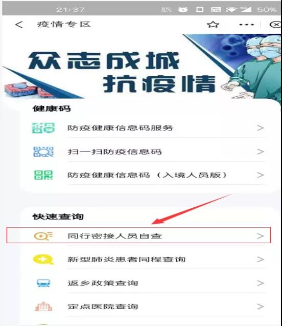 1、支付寶搜索并進入豫事辦界面,進入疫情專區(qū)點擊紅框功能按鈕,打開同行密接人員自查功能;