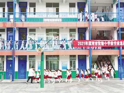 9月18日上午,郾城區(qū)人防辦組織開展防空演練及宣傳活動。圖為市實(shí)驗(yàn)小學(xué)的學(xué)生在老師帶領(lǐng)下,以最快的速度從教室撤離到操場。見習(xí)記者 王嘉明 攝